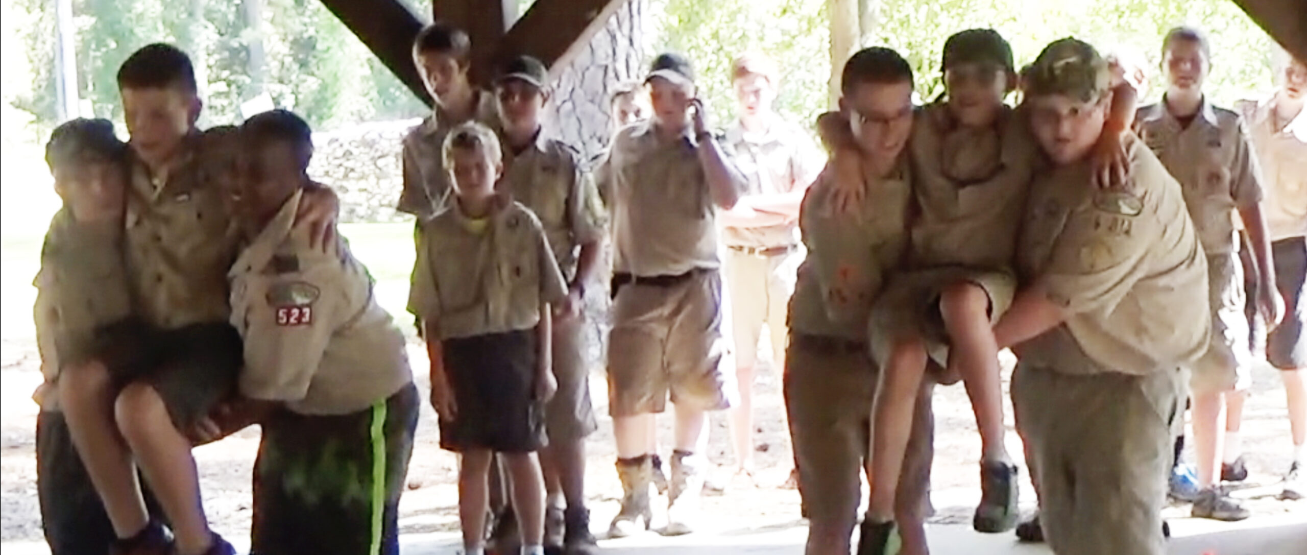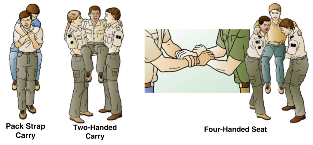 Patrols line up in relay fashion facing a single turnaround post located 15 feet away. One Scout carries the first “injured Scout” using a Pack Strap Carry around a turnaround pint and back to the starting line. Next, Two Scouts from each patrol carry the second “injured Scout” using a Two-Person Carry around the turnaround point and back to the starting line. Finally, two Scouts carry the third “injured Scout” using a Four-Handed Seat Carry around the turnaround point and back to the starting line. If at any time an “injured Scout” touches the ground, the Scouts carrying this “injured Scout” must stop, reform their carry and continue.