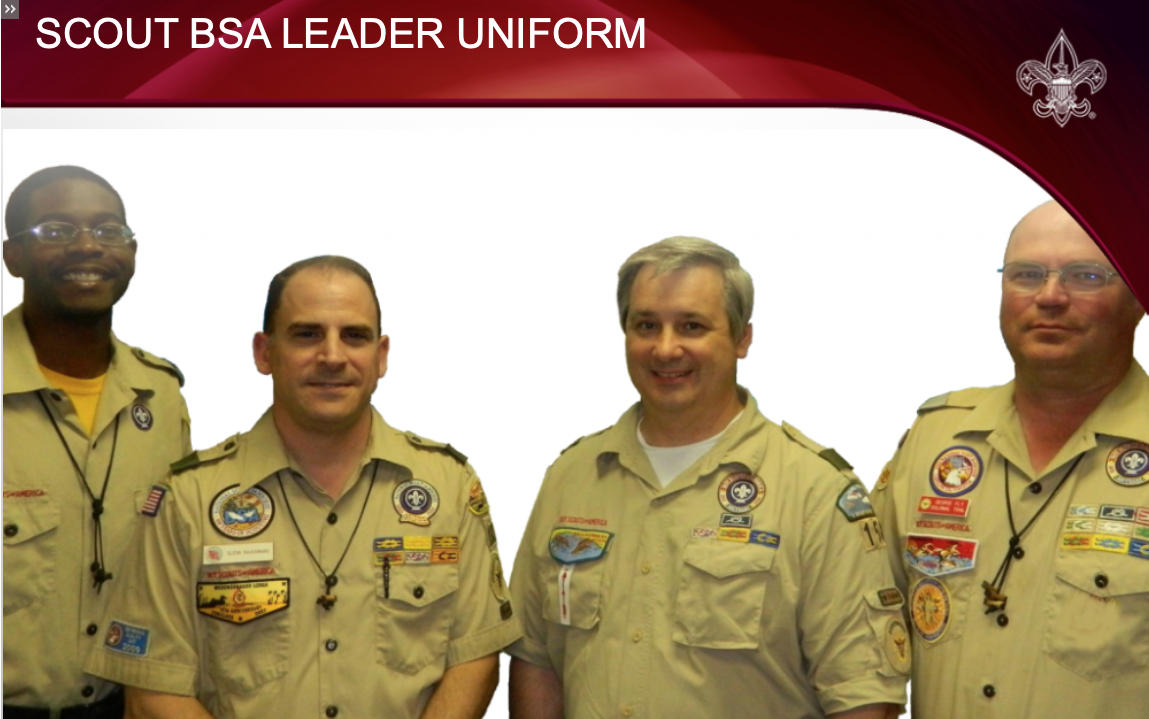 REPLACE this version of the photo. It has appeared repeatedly throughout the training and on each occasion, substitutes have been selected that more closely apply to the narrative. Here it is again, and here it would be appropriate IF the Scouter on the right was not wearing his National Camping School patch on the left pocket. This patch, like all temporary patches is worn on the right pocket! So, I’ve taken the same frame and photo-shopped out the patch. With this done, the photo represents proper uniforming for inclusion in this section.Click above for larger image.