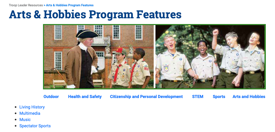 Next 11 THE TROOP MEETING: PROGRAM FEATURES “Arts and Hobbies . . .” The screen shot below is taken from the corresponding category of Program Features. Click above for larger view. PREVIOUS NEXT