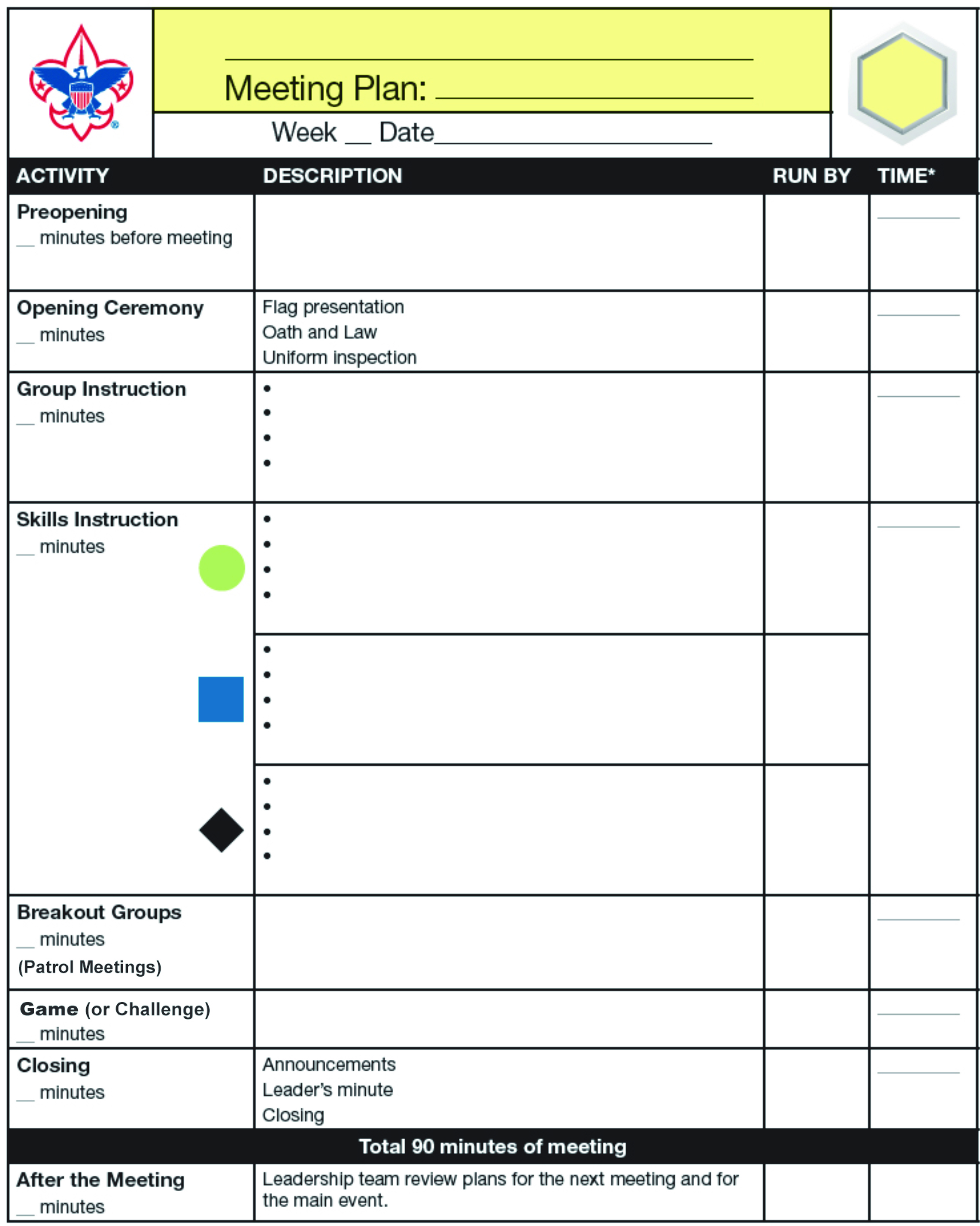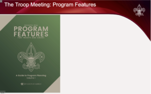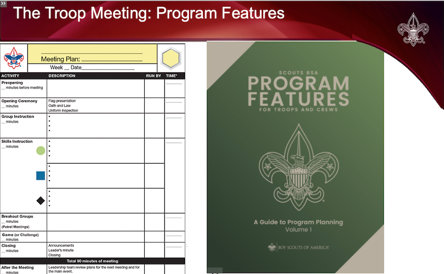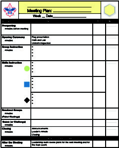 “The Troop Meeting Planning Form is found in Program Features. It’s a valuable tool for preparing successful meetings agendas. Reflected in the form are the eight parts of a troop meeting.”