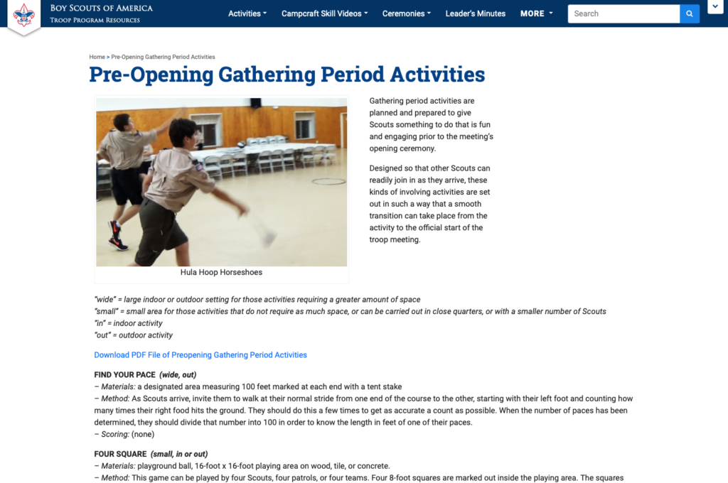 “Several ideas for preopening activities can be found in Troop Program Resources, troopresources.scouting.org.”