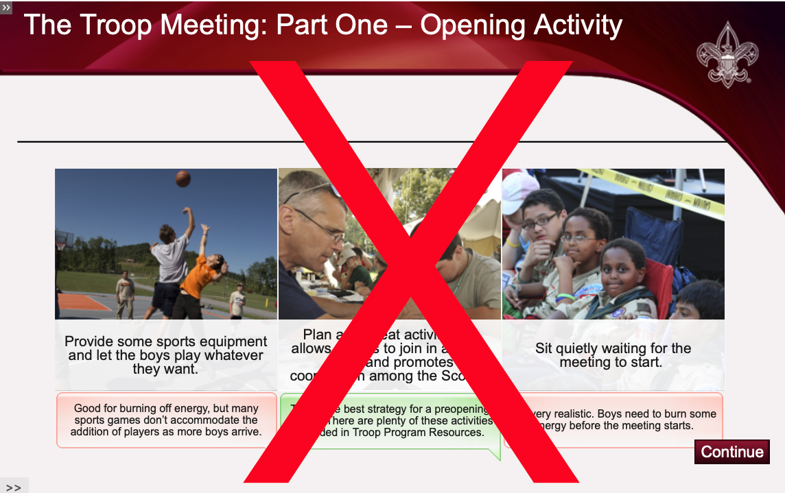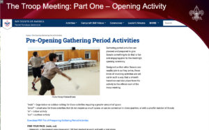 “An assistant Scoutmaster may be assigned to coach and support the Scout leading the preopening. To keep the meetings fresh, the preopening activity should not be the same every week. What do you think would make a good preopening activity? Click on each to find out.”