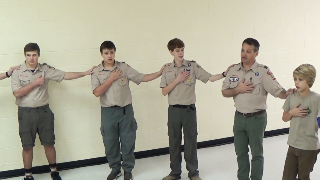 As reflected in the Troop Meeting Planning Form, Part 7 of the troop meeting consists of three parts: any final announcements, a leader’s minute, and then a closing ceremony. The following text is from the ceremonies section of Troop Program Resources, along with information as to where the troop leaders can access a library of closing ceremonies. The following photo is from an actual closing ceremony: