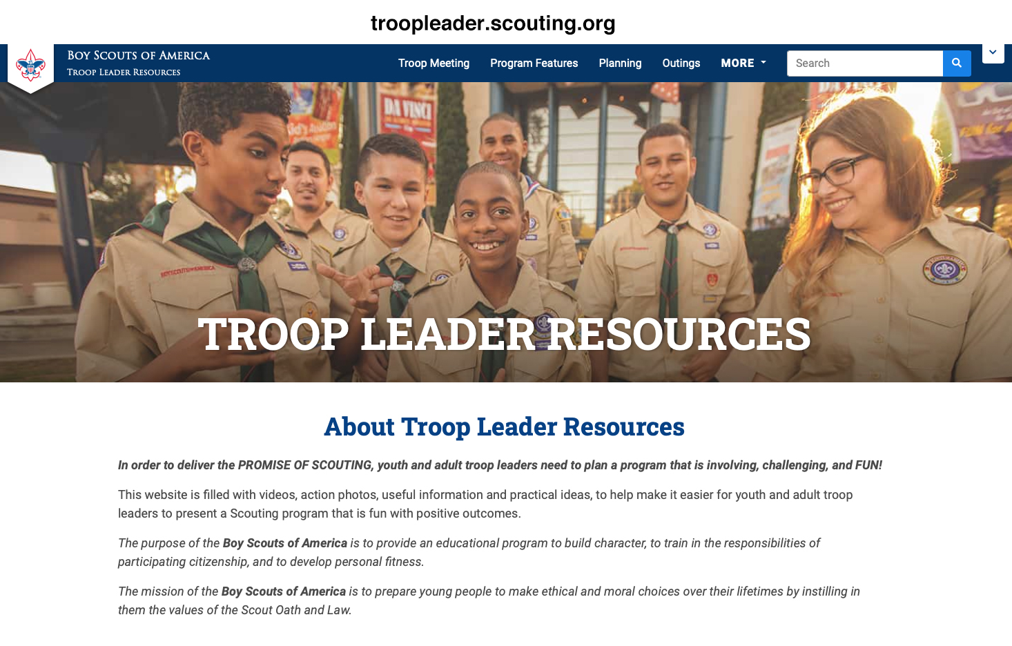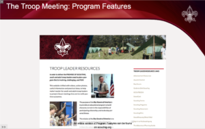 Next 5 THE TROOP MEETING: PROGRAM FEATURES “An online version of Program Features can be found on scouting.org. IN TROOP LEADER RESOURCES.” The photo below is a screen shot of the current Troop Leader Resources website including the web address. Click on the image for a larger resolution. PREVIOUS NEXT