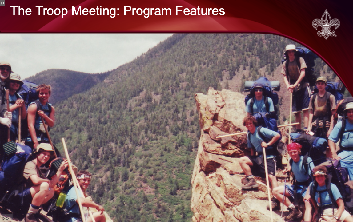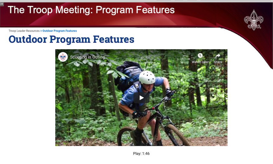 The screen shot below represents the Outdoor Program Features category. The image for this first of six categories is the title shot from the “Scouting is Outing” video that heads up the 23 monthly themes in this major category.