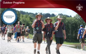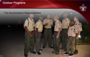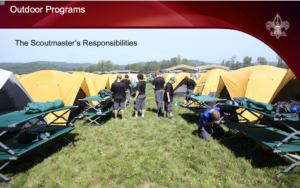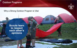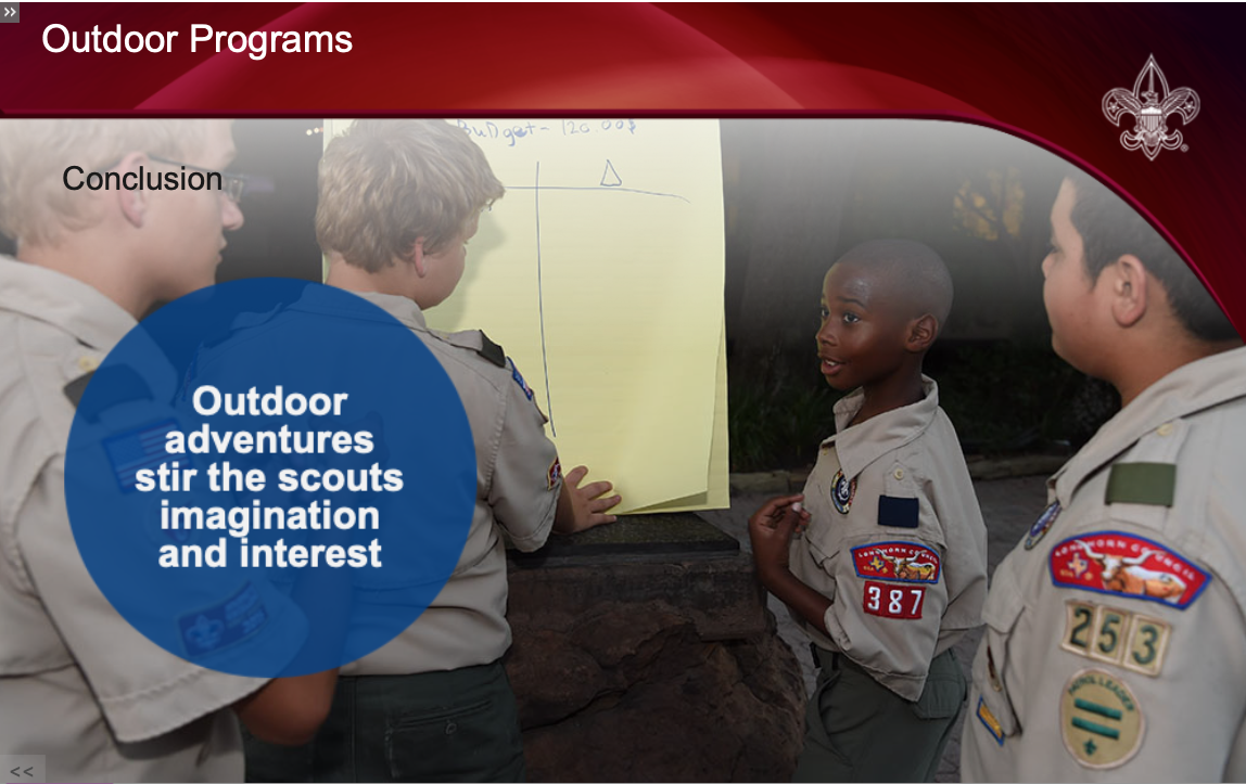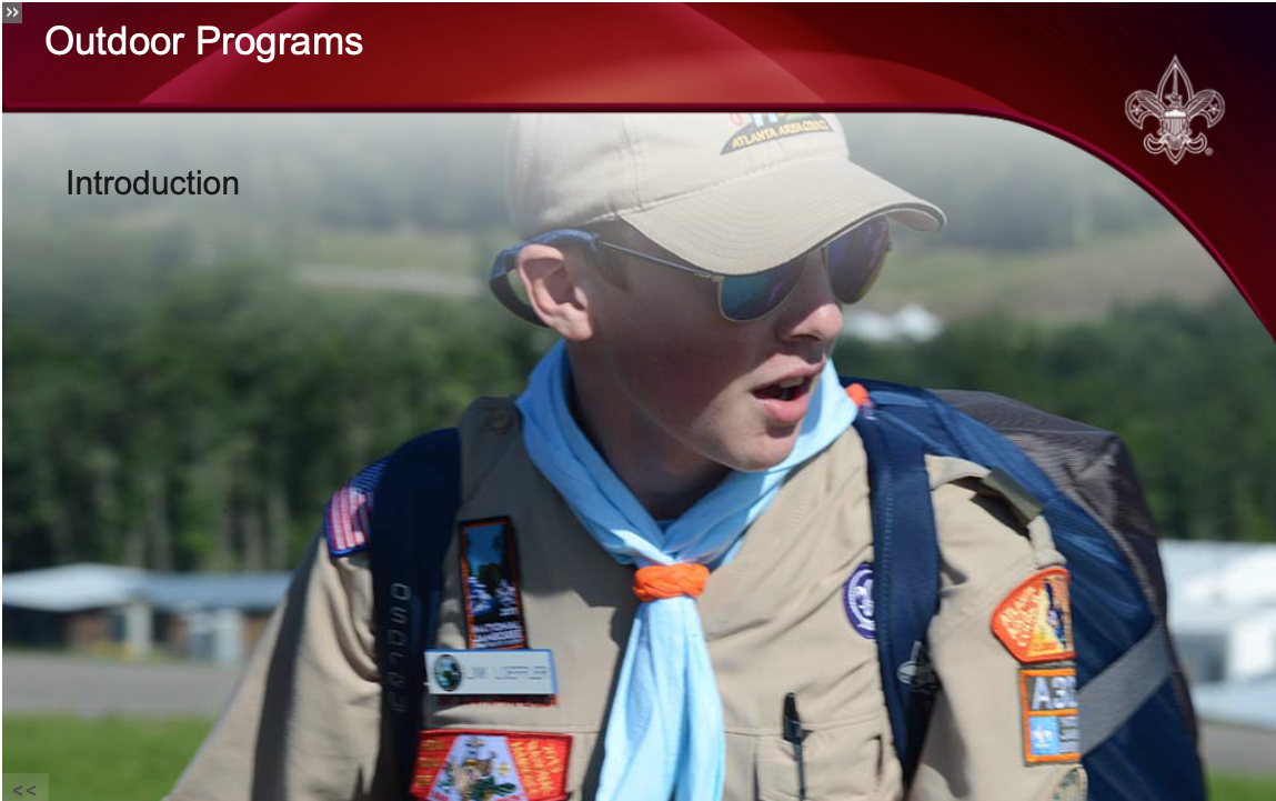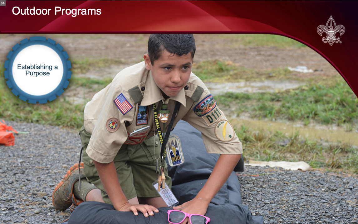 1 REPACE with a photo of a group of Scouts in the great outdoors! 1 Click above for larger view.2 Packs all scattered around should be organized in pack lines. REPLACE with a photo that provides a more typical depiction of Scout camping.2 Click above for larger view.3 (Jamboree photo) If there are too many Jambo photos, then REPLACE this with one that compliments the corresponding narrative.3 Click above for larger view.4 This Jambo photo can be REPLACED with one that also compliments the narrative.4 Click above for larger image.5 Another Jamboree photo which can be REPLACED with an alternate that depicts a Scout patrol working together. 5 Click above for larger photo.6 This Scouter is wearing gold shoulder loops, and temporary patches on her left pocket. REPLACE with a properly-uniformed, genuine SM.6 Click above for larger image.7 We don’t generally use this kind of compass. REPLACE with one that has a baseplate.7 Click above for larger image.8 Nothing against Garfield, but these Scouts appear to be from different troops. REPLACE with a shot of an SM in the outdoors.8 Click above for larger image.9 This photo is of an outdoor experience that happens only every four years. REPLACE with a photo that examples a program feature, outdoor activity.9 Click above for a larger view.10 These Scouts appear to be from different units. Insert the following appropriate photo that appears two frames later.10 This image is currently featured two frames hence and compliments the narration for this frame.11 So as not to repeat this image, REPLACE it with a photo that illustrates a Scout “learning by doing” (as stated in the narration) in an outdoor setting.11 Click above for larger photo.