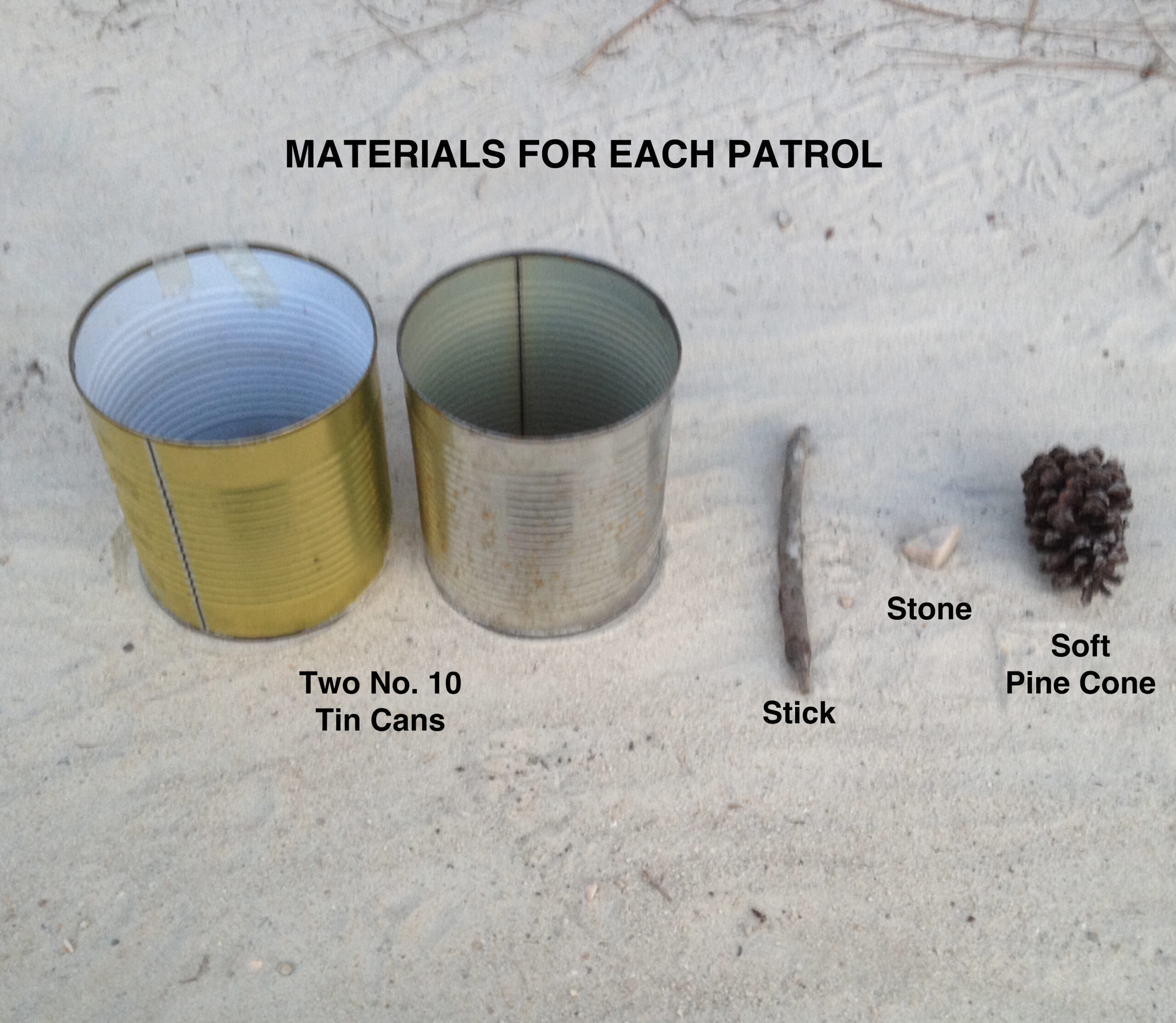 The leader calls out a number and a name of an object. Scouts having that number race to the can, pick out the object named, transfer it to the can at the other end of the patrol line, and return to their places. Scouts must keep track of objects as they are transferred from can to can. When their number is called, they must know where to find the object. Other small items can readily be substituted for the stick, stone and pine cone.