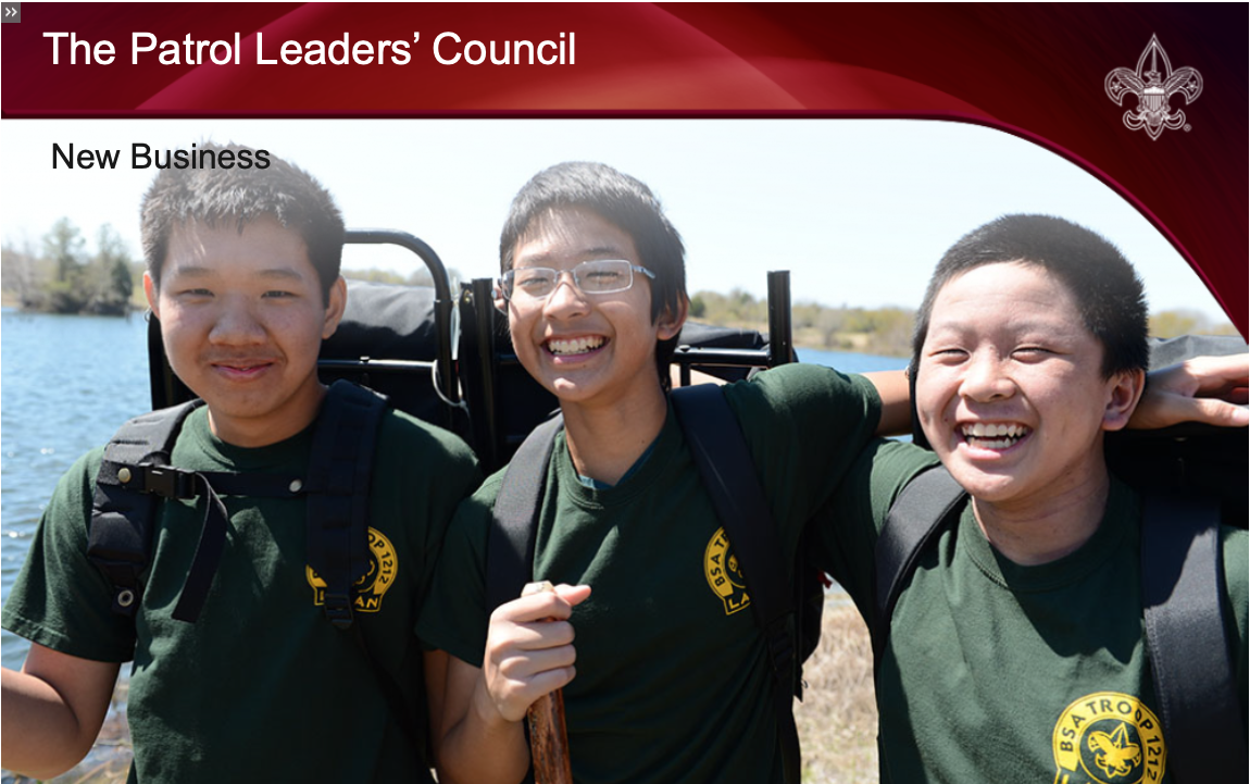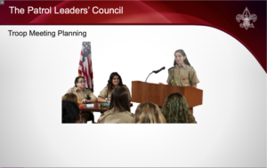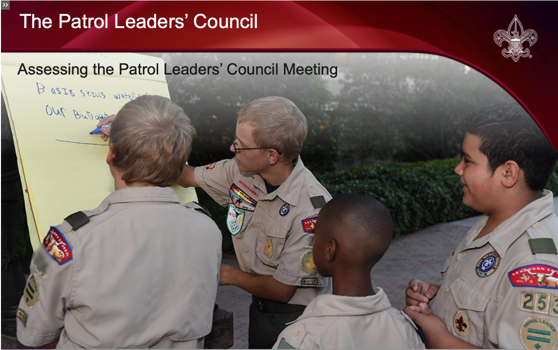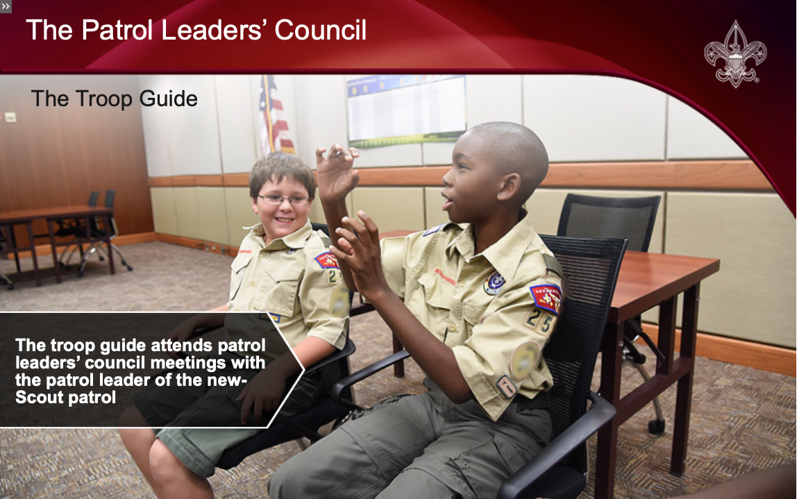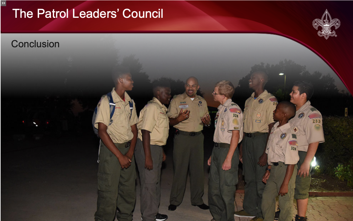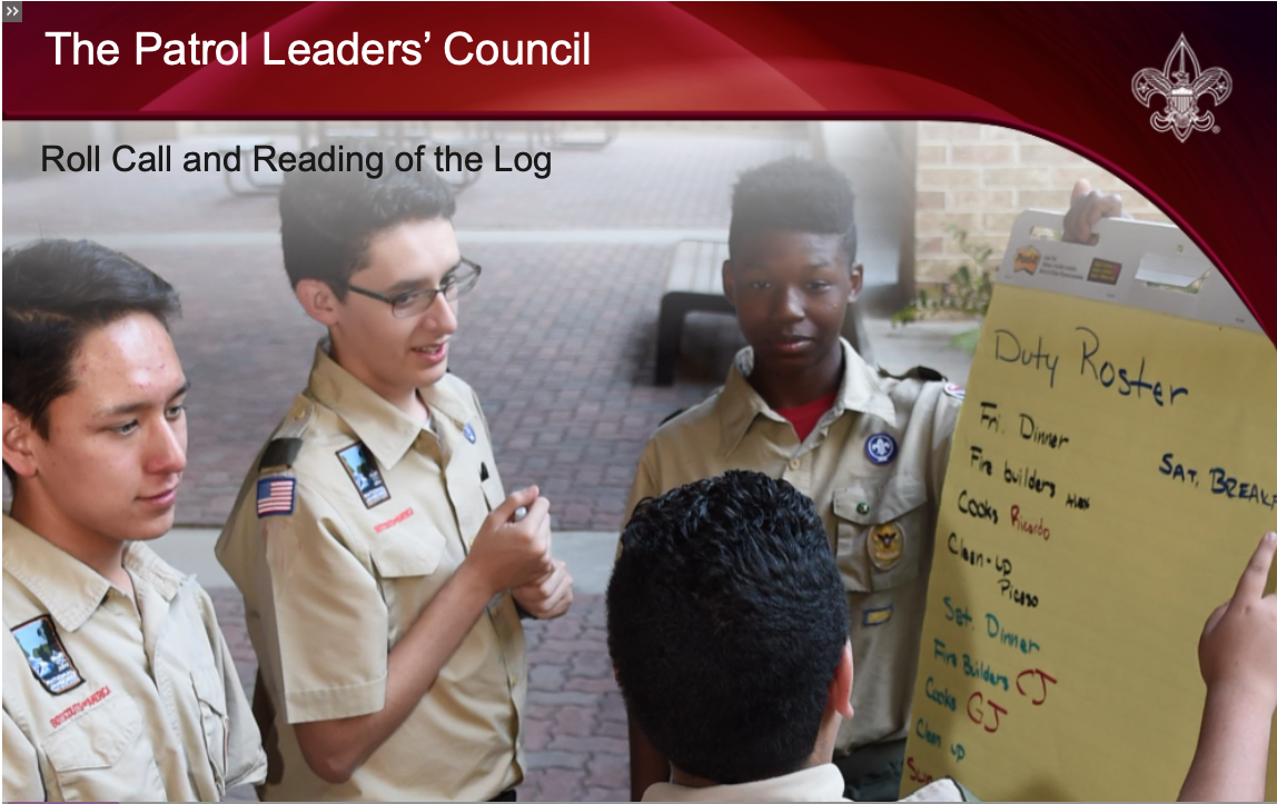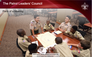 24 REPLACE with a photo of the troop scribe reading the minutes.24 Click above for larger image.25 REPLACE with a photo of a PL delivering patrol report during a real PLC meeting.25 Click above for larger photo.26 REPLACE with photo of PLC voting to accept minutes.Click above for larger photo.27 REPLACE with a screen shot of a list of the 48 Program Features pointing at the chosen feature for the month.27 Click above for larger image.28 REPLACE with a screen shot of an overview of the month’s Main Event plans.28 Click above for larger view.29 REPLACE with a photo of the PLC discussing the Main Event.29 Click above for larger photo.30 REPLACE with a cleaner version.30 Click above for larger view.31 REPLACE with a photo of PLC members looking over the troop meeting planning forms.31 Click above for larger view.32 REPLACE with a photo of the SPL assigning responsibilities.32 Click above for a larger view.33 REPLACE with a screen shot of skills instruction for the month’s program feature.33 Click above for larger view.34 DELETE this frame—superfluous. (Add the corresponding narration to that of the previous frame.)35 REPLACE with a photo of a real PLC engaged in a group discussion.35 Click above for larger photo.36 REPLACE with a photo of the PLC’s troop engaged in a service project or patrol outing in order to match narration.36 Click above for larger view.37 REPLACE with a photo of some eyebrow-raising behavior from the troop..37 Click above for larger image.38 REPLACE with a photo of SPL and ASPL from the troop conversing with the SM.38 Click above for larger view.39 REPLACE with a photo of the same troop’s SM delivering a leaders’ minute to the PLC.39 Click above for larger view.40 REPLACE with the same SM happy with the PLC.40 Click above for larger view.41 ADJUST the narration to reflect the updated web address for Troop Program Resources: —> troopresources.scouting.org42 REPLACE with a photo of an SPL and SM discussion.42 Click above for larger photo.43 REPLACE with a photo of a real PLC from the same troop.43 Click above for larger photo.44 REPLACE with a photo of an SPL in touch with members of the PLC.44 Click above for larger photo.45 REPLACE with a photo that illustrates Scouts evaluating a troop event.45 Click above for full resolution.46 REPLACE with a photo of a real PLC who are all from the same troop.