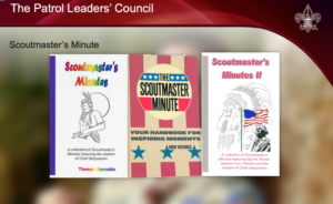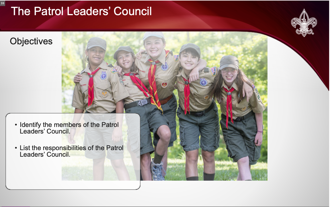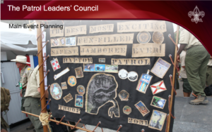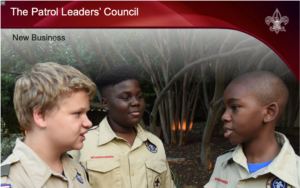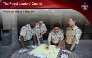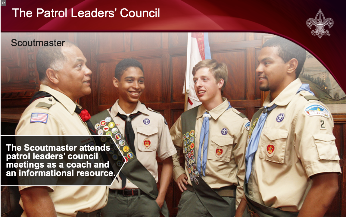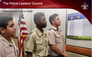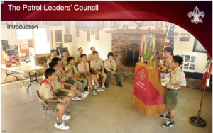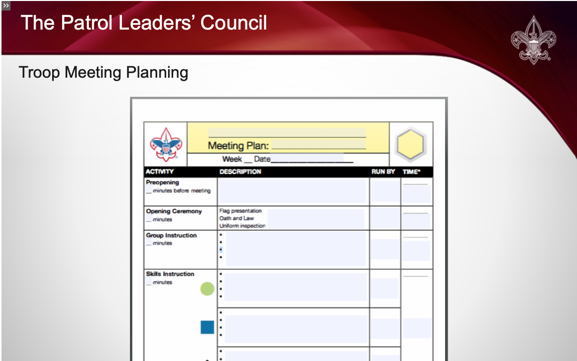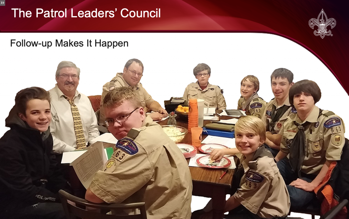 24 REPLACE with a photo of the troop scribe reading the minutes.24 Click above for larger image.25 REPLACE with a photo of a PL delivering patrol report during a real PLC meeting.25 Click above for larger photo.26 REPLACE with photo of PLC voting to accept minutes.Click above for larger photo.27 REPLACE with a screen shot of a list of the 48 Program Features pointing at the chosen feature for the month.27 Click above for larger image.28 REPLACE with a screen shot of an overview of the month’s Main Event plans.28 Click above for larger view.29 REPLACE with a photo of the PLC discussing the Main Event.29 Click above for larger photo.30 REPLACE with a cleaner version.30 Click above for larger view.31 REPLACE with a photo of PLC members looking over the troop meeting planning forms.31 Click above for larger view.32 REPLACE with a photo of the SPL assigning responsibilities.32 Click above for a larger view.33 REPLACE with a screen shot of skills instruction for the month’s program feature.33 Click above for larger view.34 DELETE this frame—superfluous. (Add the corresponding narration to that of the previous frame.)35 REPLACE with a photo of a real PLC engaged in a group discussion.35 Click above for larger photo.36 REPLACE with a photo of the PLC’s troop engaged in a service project or patrol outing in order to match narration.36 Click above for larger view.37 REPLACE with a photo of some eyebrow-raising behavior from the troop..37 Click above for larger image.38 REPLACE with a photo of SPL and ASPL from the troop conversing with the SM.38 Click above for larger view.39 REPLACE with a photo of the same troop’s SM delivering a leaders’ minute to the PLC.39 Click above for larger view.40 REPLACE with the same SM happy with the PLC.40 Click above for larger view.41 ADJUST the narration to reflect the updated web address for Troop Program Resources: —> troopresources.scouting.org42 REPLACE with a photo of an SPL and SM discussion.42 Click above for larger photo.43 REPLACE with a photo of a real PLC from the same troop.43 Click above for larger photo.44 REPLACE with a photo of an SPL in touch with members of the PLC.44 Click above for larger photo.45 REPLACE with a photo that illustrates Scouts evaluating a troop event.45 Click above for full resolution.46 REPLACE with a photo of a real PLC who are all from the same troop.