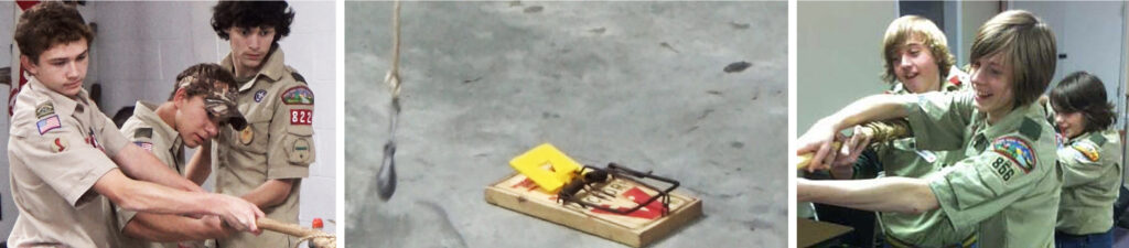 For each team, you’ll need four 5-foot Scout staves (hiking staffs, available through your council’s service center), six 6-foot lashing ropes, one 3-foot cord, one fishing sinker and at least one mouse or rattrap.