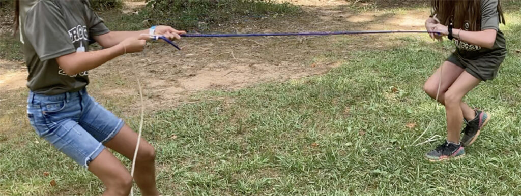 For every two teams, you’ll need one 4-foot and two 10-foot x 1/4-inch braided nylon cords, and a 40-foot playing area with a marked center line. The object of this game is to pull the 4-foot rope away from the other other team. The contest can be played between patrol teams or between chosen troop teams.