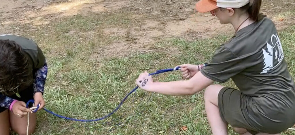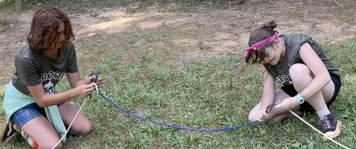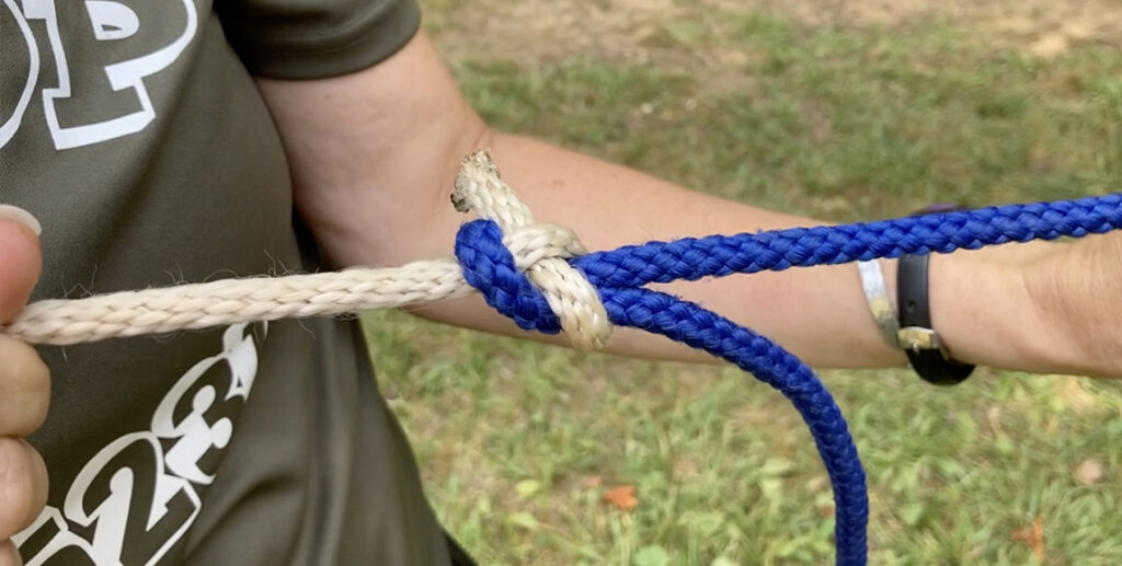 Whereas the square knot serves to bind the lines down onto an object, the sheet bend serves to “bend” two lines together, and, unlike the square knot, even when pulled very tight, it’s easy to undo. To learn how to tie a sheet bend, refer to the Scouts BSA Handbook. View How to Tie a Sheet Bend video: https://youtu.be/Hfhyl6jLnNk?si=YHnnhd7XH08cS-pl